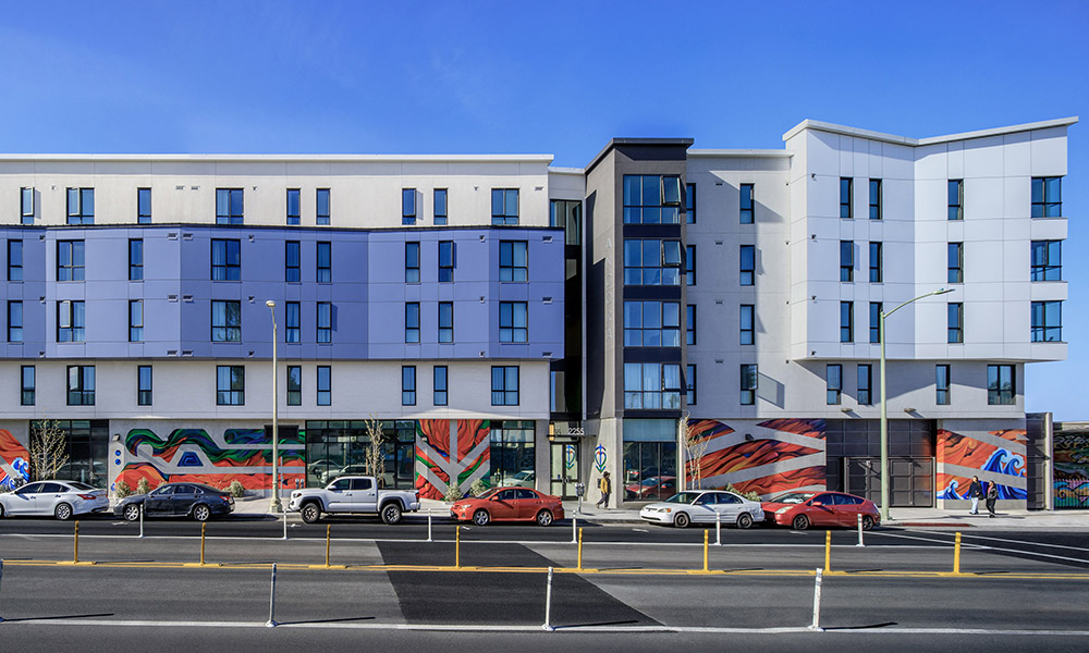 Ancora Place transforms a 260-foot midblock parcel on Oakland’s International Boulevard from light industrial and storage uses to a health-forward, community-focused, 77-home affordable mixed-use development. The project simultaneously densifies the city’s most diverse neighborhood, strengthens a Bus Rapid Transit corridor, programmatically and expressively supports a neighboring community organization, and introduces a community-supporting storefront of retail, publicly-accessible community room, and access to a verdant, 14,000-square-foot courtyard gathering space. Ancora Place supports individual and family residents earning 15-60% of the Area Median Income, including warp-around services for 16 households exiting homelessness that have a serious mental health diagnosis. A vibrant urban presence is reinforced by layered materials above an extensive mural by local artists that, along with the new storefront spaces, activate the International Blvd / Tempo Bus Rapid Transit line. A layered, undulating façade breaks up the project’s mass while integrating it into the block’s existing data. Ancora Place is the latest of three contiguous developments led by a nonprofit developer that began with the securing of a local community and cultural organization (EastSide Arts Alliance) at an adjacent renovated building; the rear yards of all three projects liaise with each other, creating opportunities for shared resources and events.